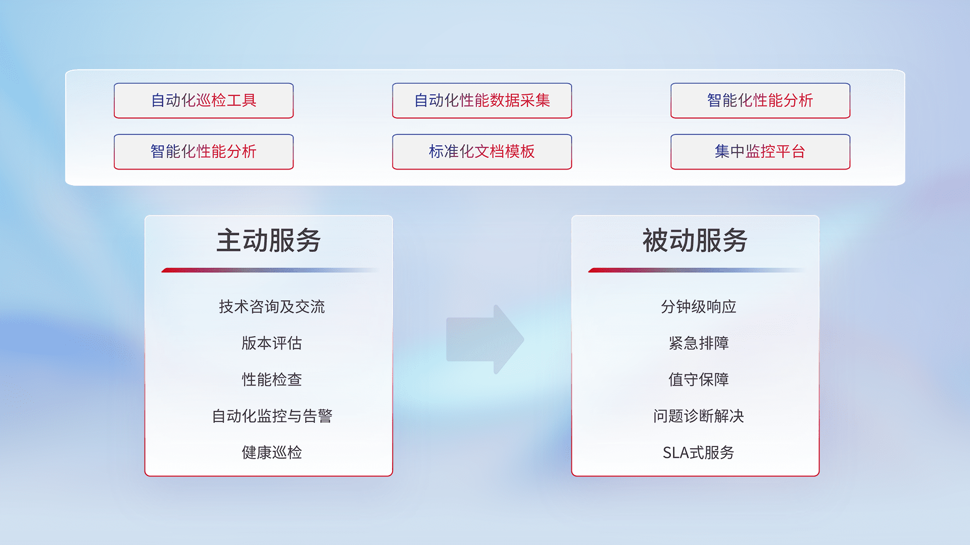 智能化工具和标准化文档,,,,保障服务质量,,,,提供主动服务(包含技术咨询、、版本评估、、、性能检查、、、自动化监控与告警、、健康巡检)和被动服务包含(分钟级响应、、紧急排障、、值守保障、、、、问题诊断解决、、、、SLA服务)。。。。