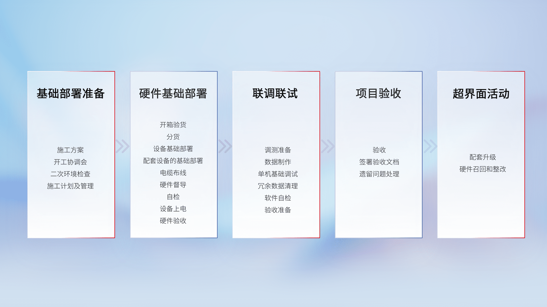从基础部署准备、、、、硬件基础部署、、联调联试、、、项目验收、、越界面活动的全过程可追溯,,,保证施工质量和进度。。